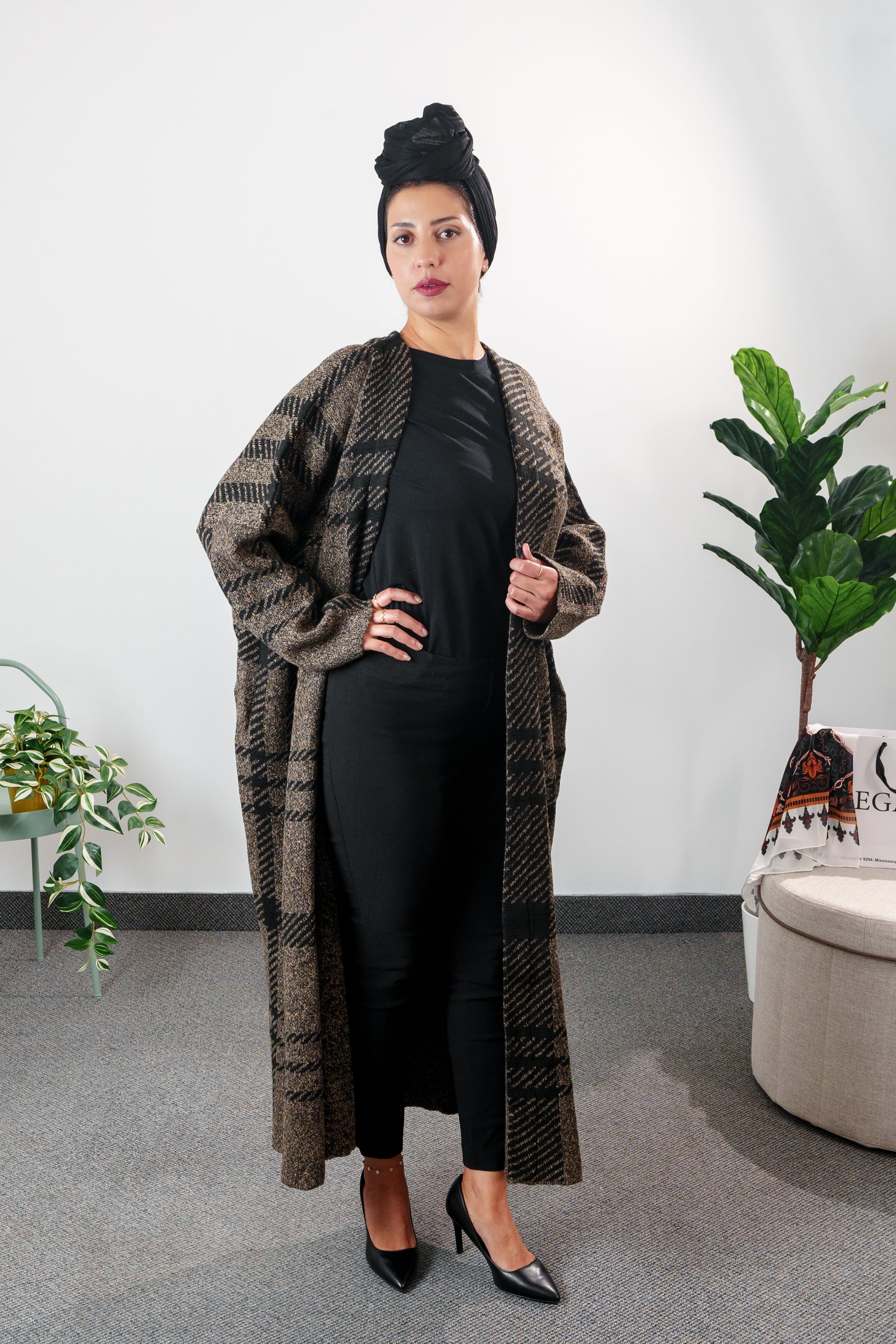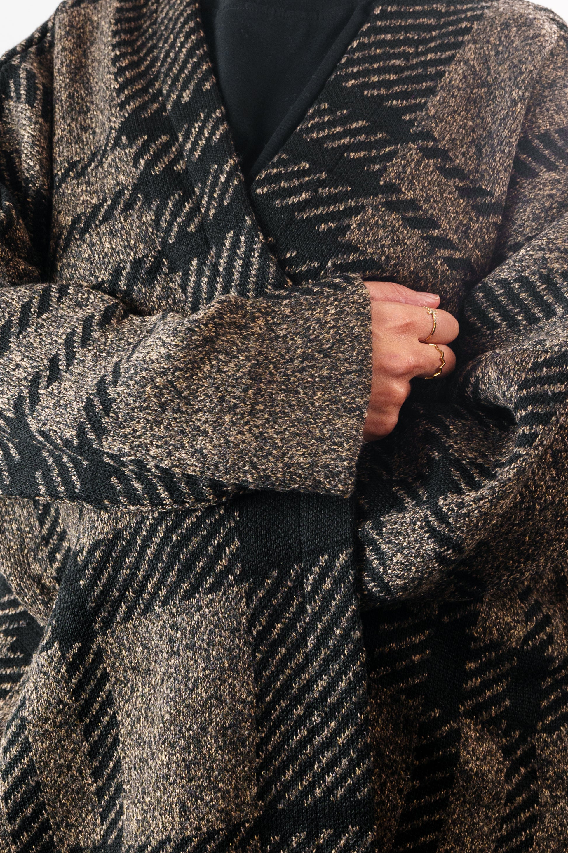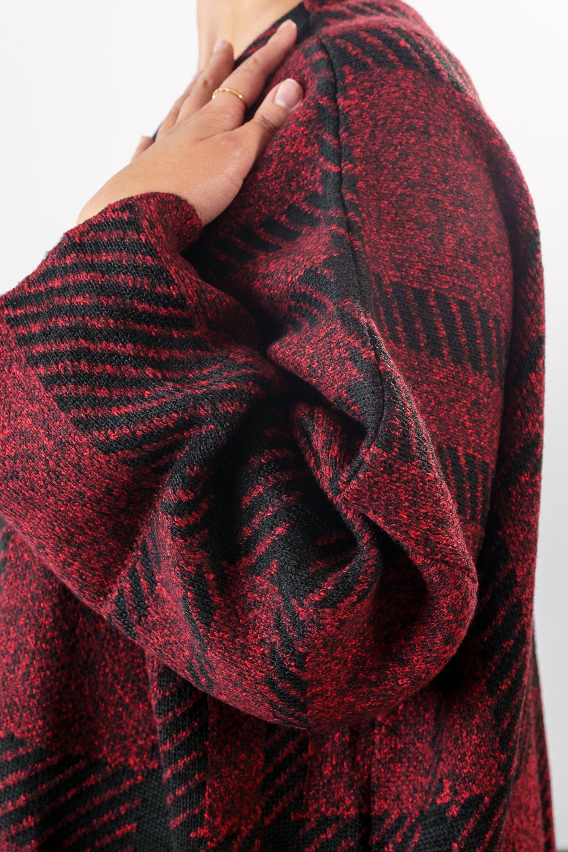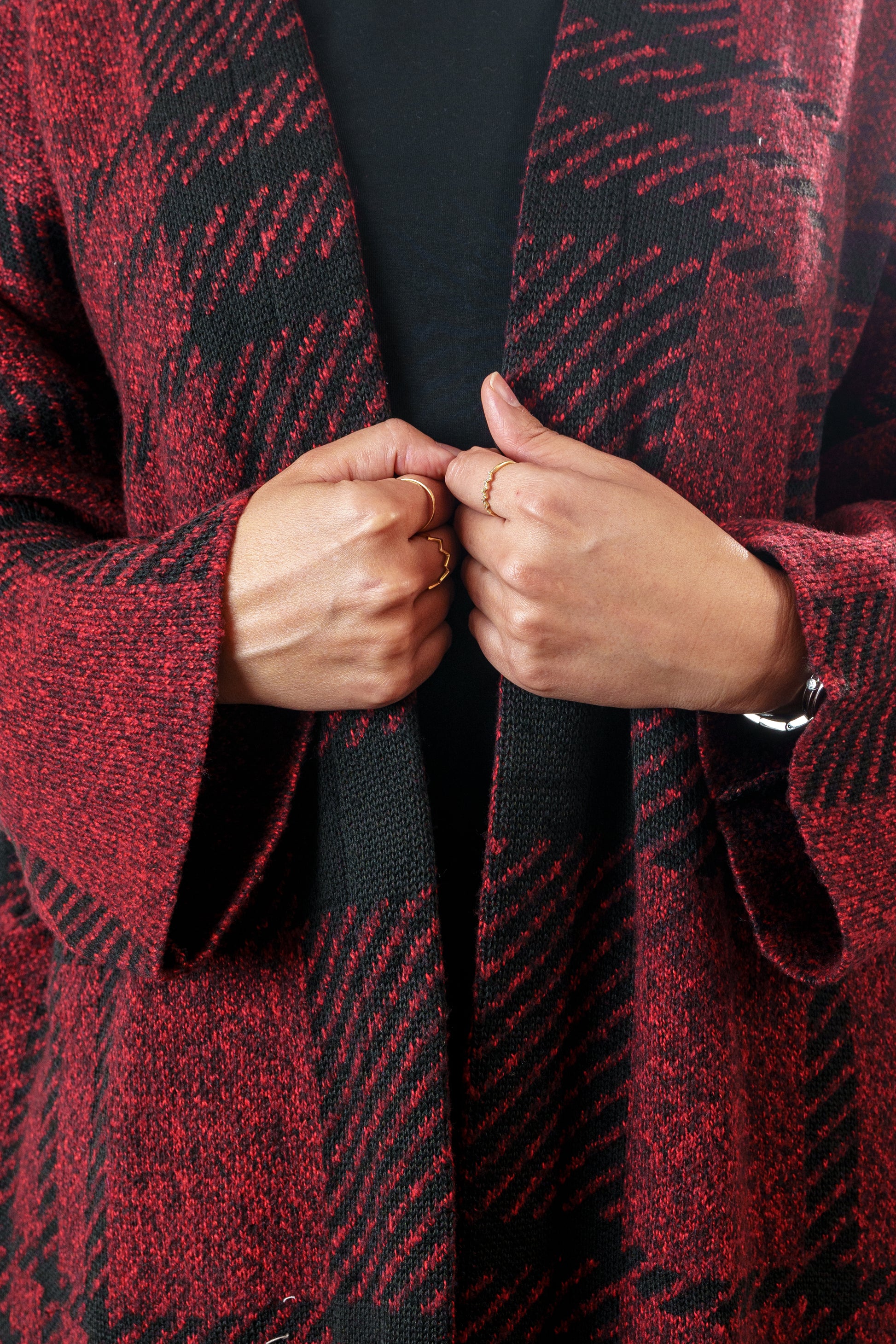 Long cardigan à carreaux rouge et noir, superposé sur une tenue noire. Le cardigan ajoute un élément confortable et élégant, parfait pour les temps plus frais et pour créer un look chic.