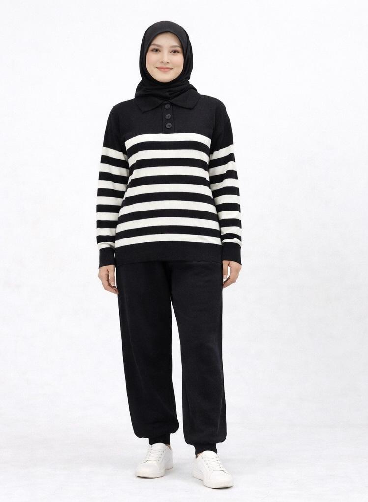 The Classic Stripe Knit Co-Ord Set is a timeless essential designed for effortless modest dressing. Featuring a soft knit, long-sleeve collared sweater with clean horizontal stripe detailing and matching relaxed-fit pants, this set balances comfort with everyday elegance. The sweater’s buttoned neckline adds a subtle polished touch, while the full-length pants with an elasticated waistband ensure ease of movement and all-day comfort. Crafted from a breathable knit fabric, this co-ord offers a flattering modest silhouette without feeling restrictive. Perfect for casual outings, travel days, or relaxed gatherings, it can be styled effortlessly with sneakers for a laid-back look or dressed up with boots and a structured bag. A versatile staple that transitions seamlessly through seasons and occasions.