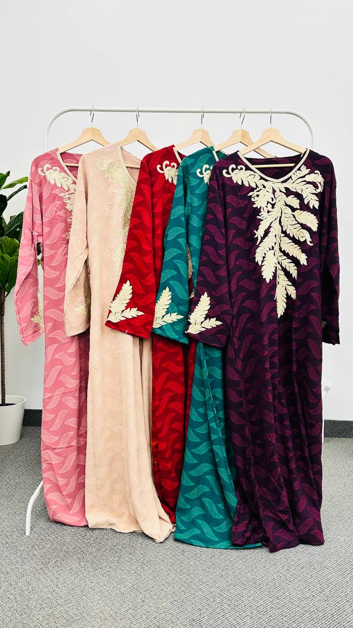 A traditional, loose-fitting dress known for its flowy silhouette and modest design. It features intricate embroidery, embellishments, and colorful prints, making it suitable for both casual wear and special occasions. The jalabiya combines comfort with elegance.