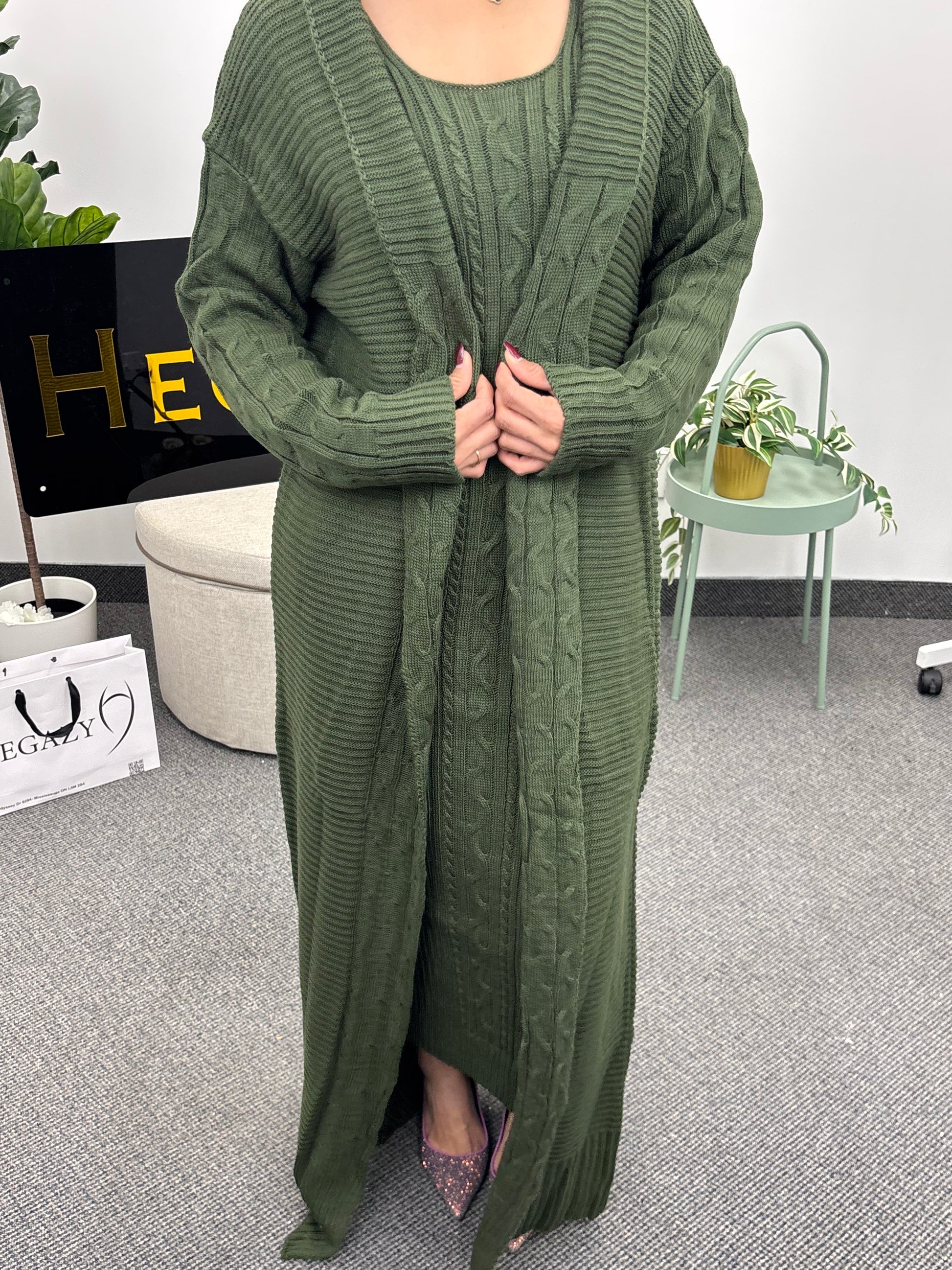 A stylish and elegant two-piece ensemble featuring a long jacket and a cut dress made from soft, breathable knit fabric. This versatile set is ideal for both casual and semi-formal occasions, pairing well with heels or boots for a polished appearance.