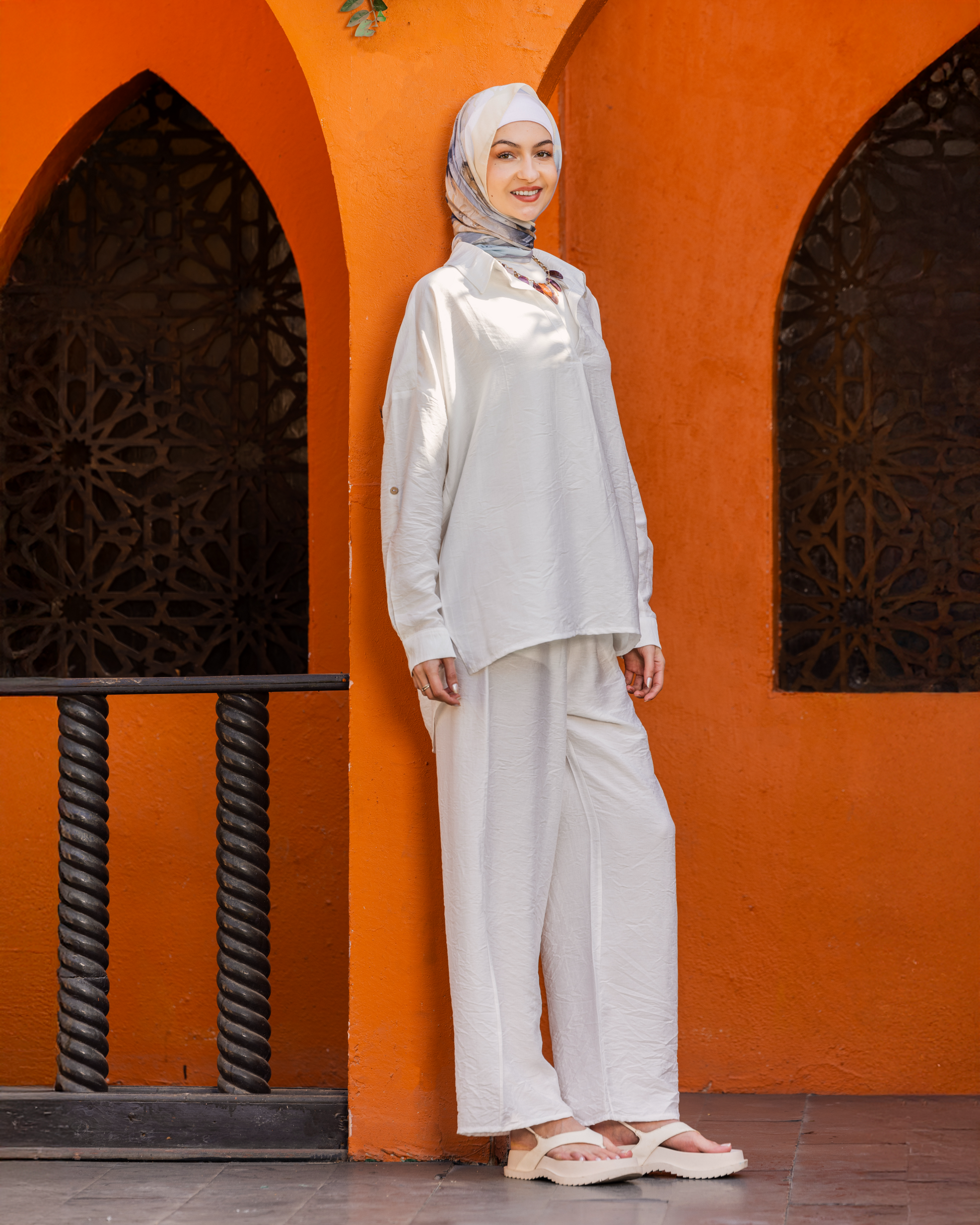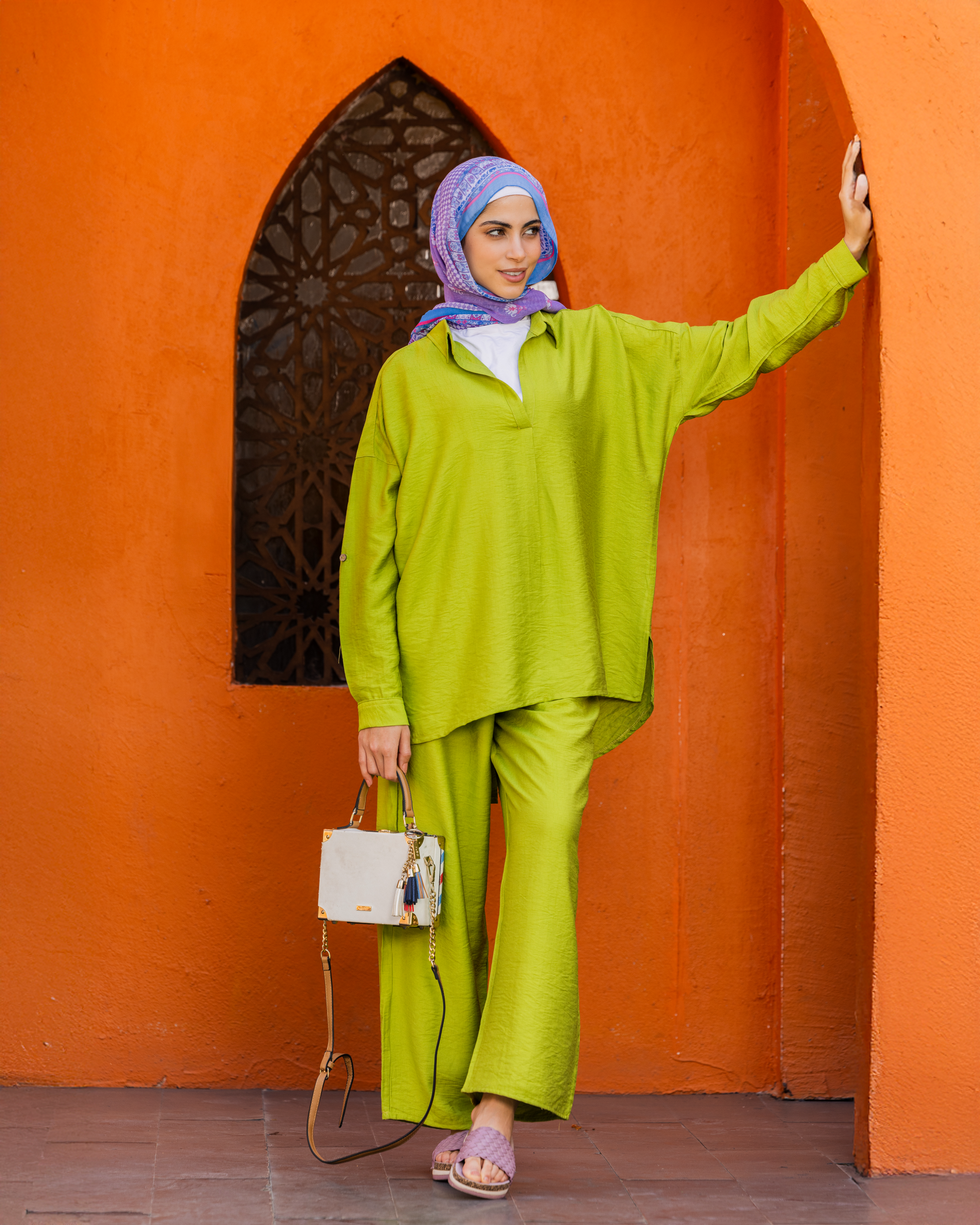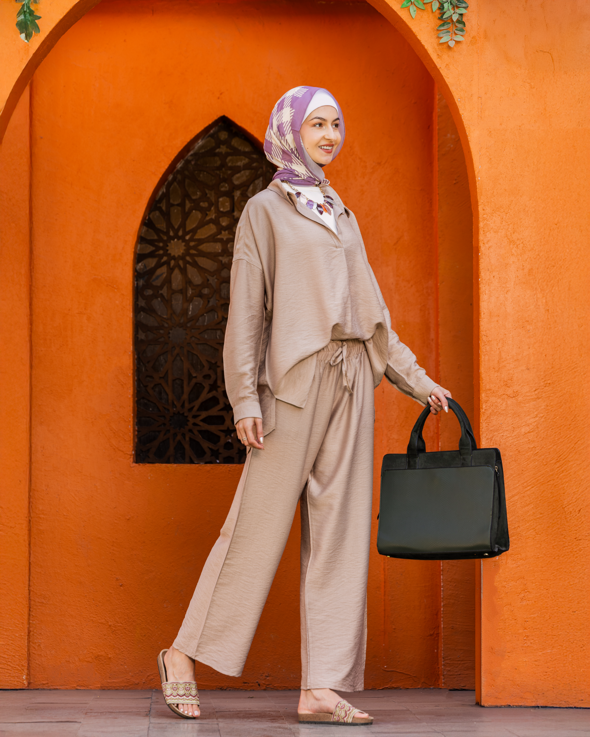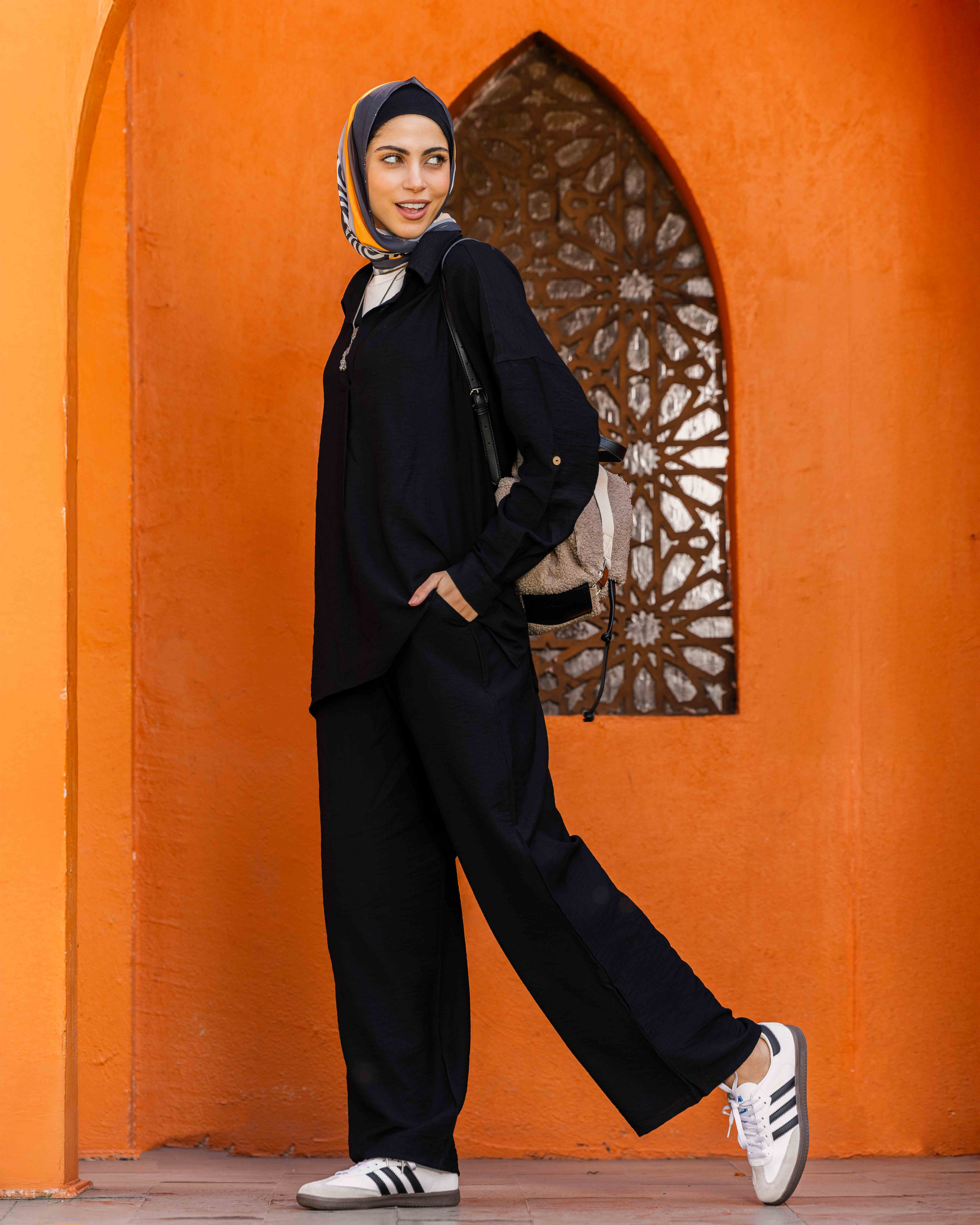 Stylish and modest two-piece outfit featuring a top and matching bottom, designed with comfort and elegance in mind. The top is accented with wooden buttons along the back, adding a unique, natural touch to the minimalist design. Made from lightweight, breathable fabric (often cotton or linen), the set is perfect for everyday wear or semi-formal occasions. The wooden buttons provide a rustic, handcrafted look, making this set both practical and fashionable. It pairs well with flats or sandals for a clean, polished appearance.