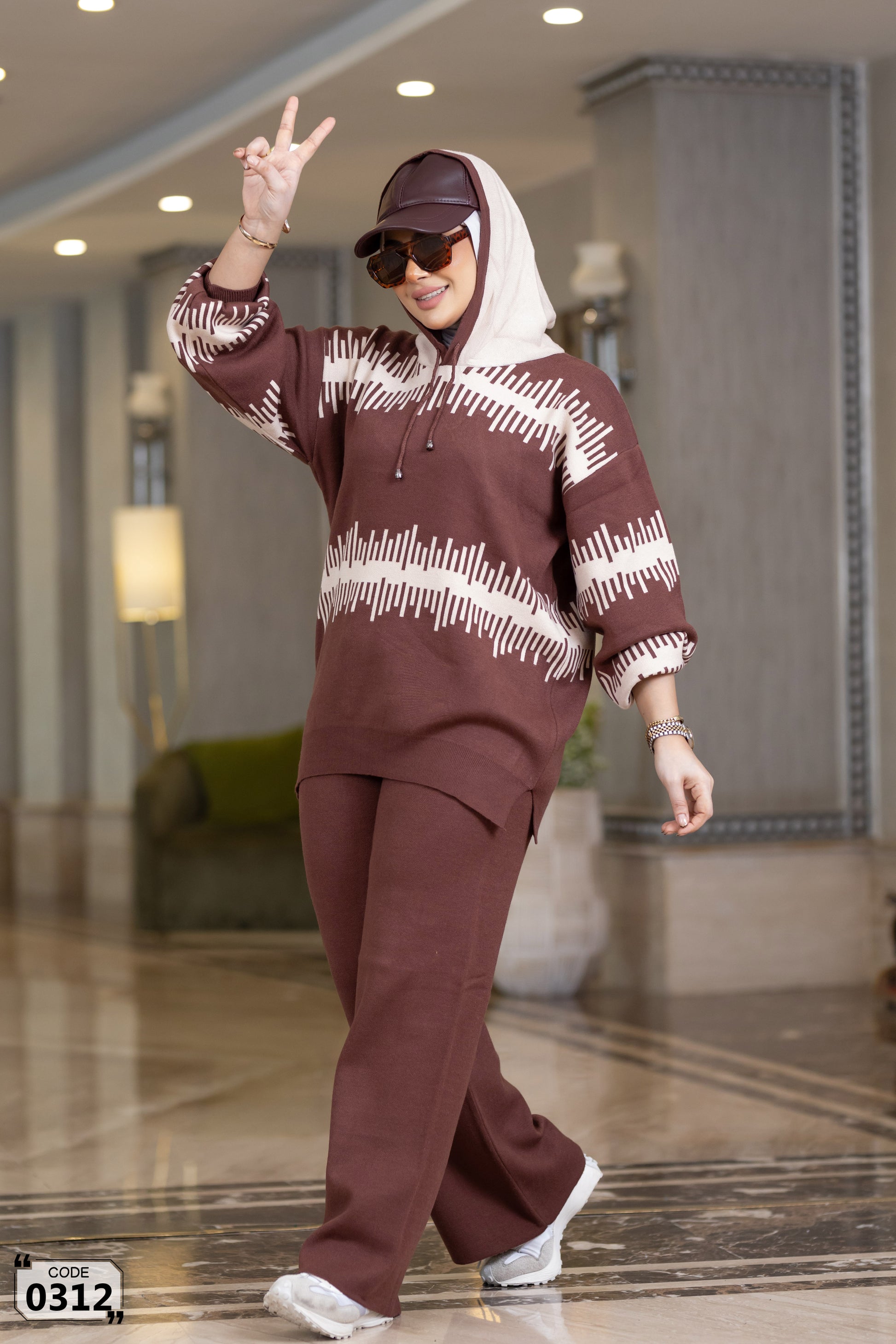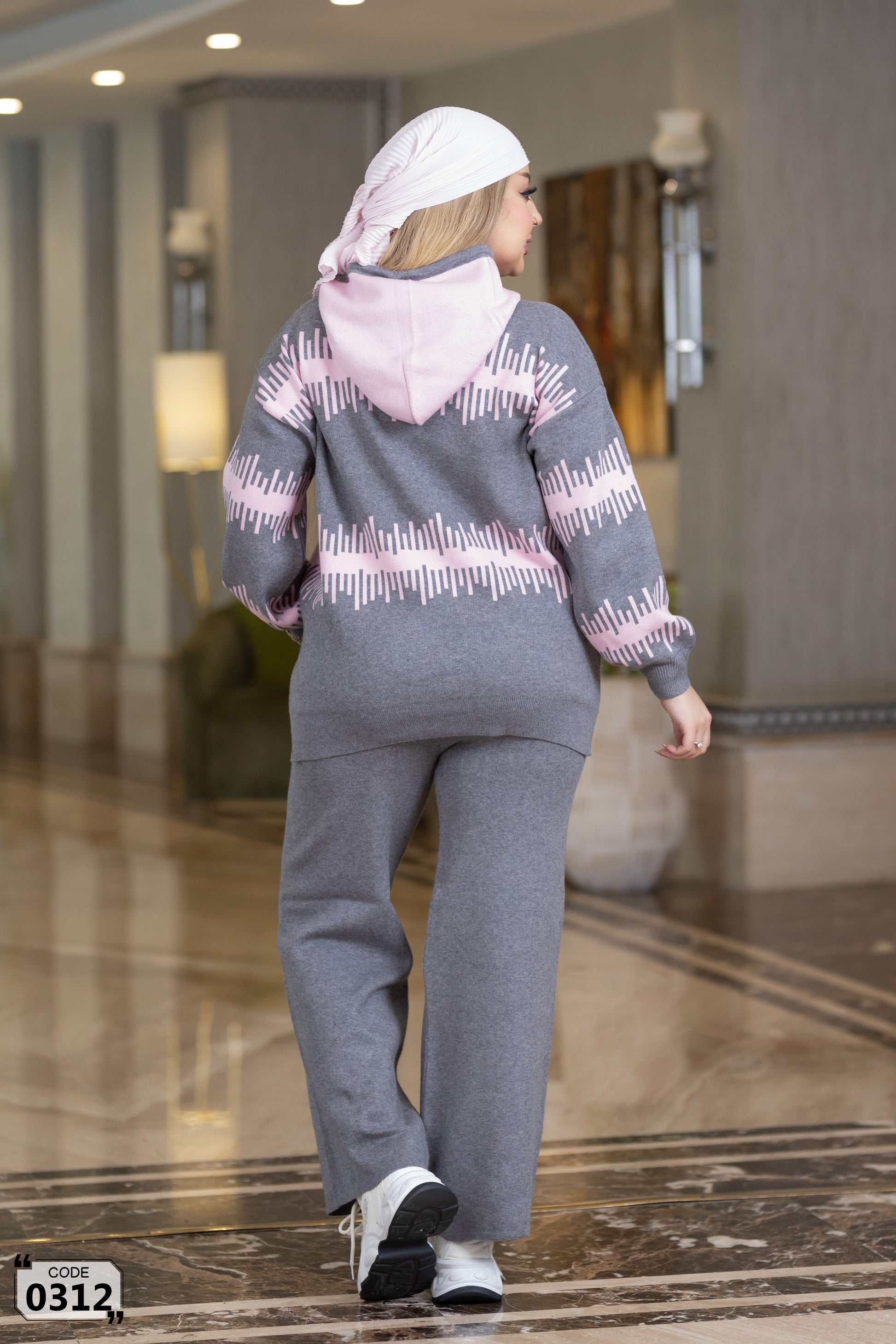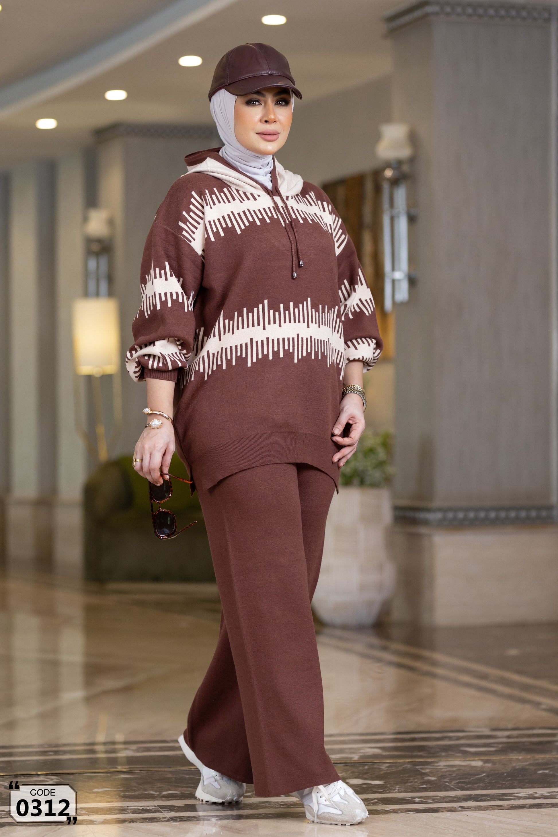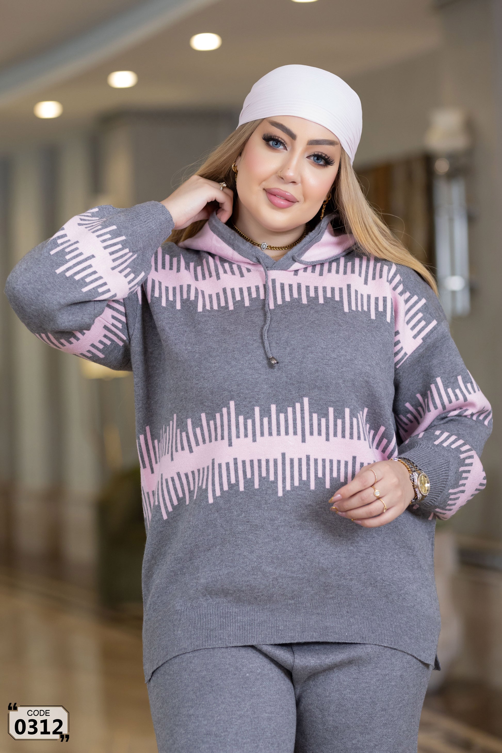 Cozy hooded two-piece knitted set in different colors and geometric pattern. Featuring an oversized hoodie with drawstring and kangaroo pocket details, paired with straight-fit soft knit trousers. Modest, comfortable and super stylish – perfect for chilly days, casual outings or staying in. Plus-size friendly with great stretch and coverage.