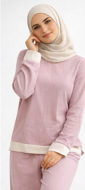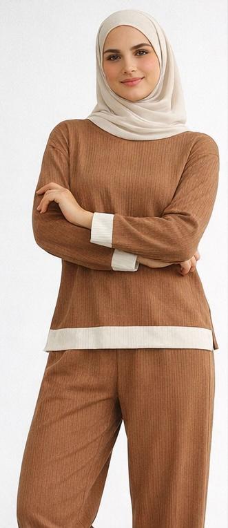 Effortlessly chic and modest, this two-piece contrast lounge set is designed for everyday comfort with a polished look. Featuring a relaxed long-sleeve top and wide-leg trousers, the set is crafted from a soft, breathable fabric that drapes beautifully on the body. Subtle contrast trims at the cuffs and hem add a refined touch while keeping the design minimal and versatile. Perfect for casual outings, travel days, or elevated loungewear, this set offers modest coverage without compromising on style. Wear it together for a coordinated look or mix and match with your wardrobe staples.
