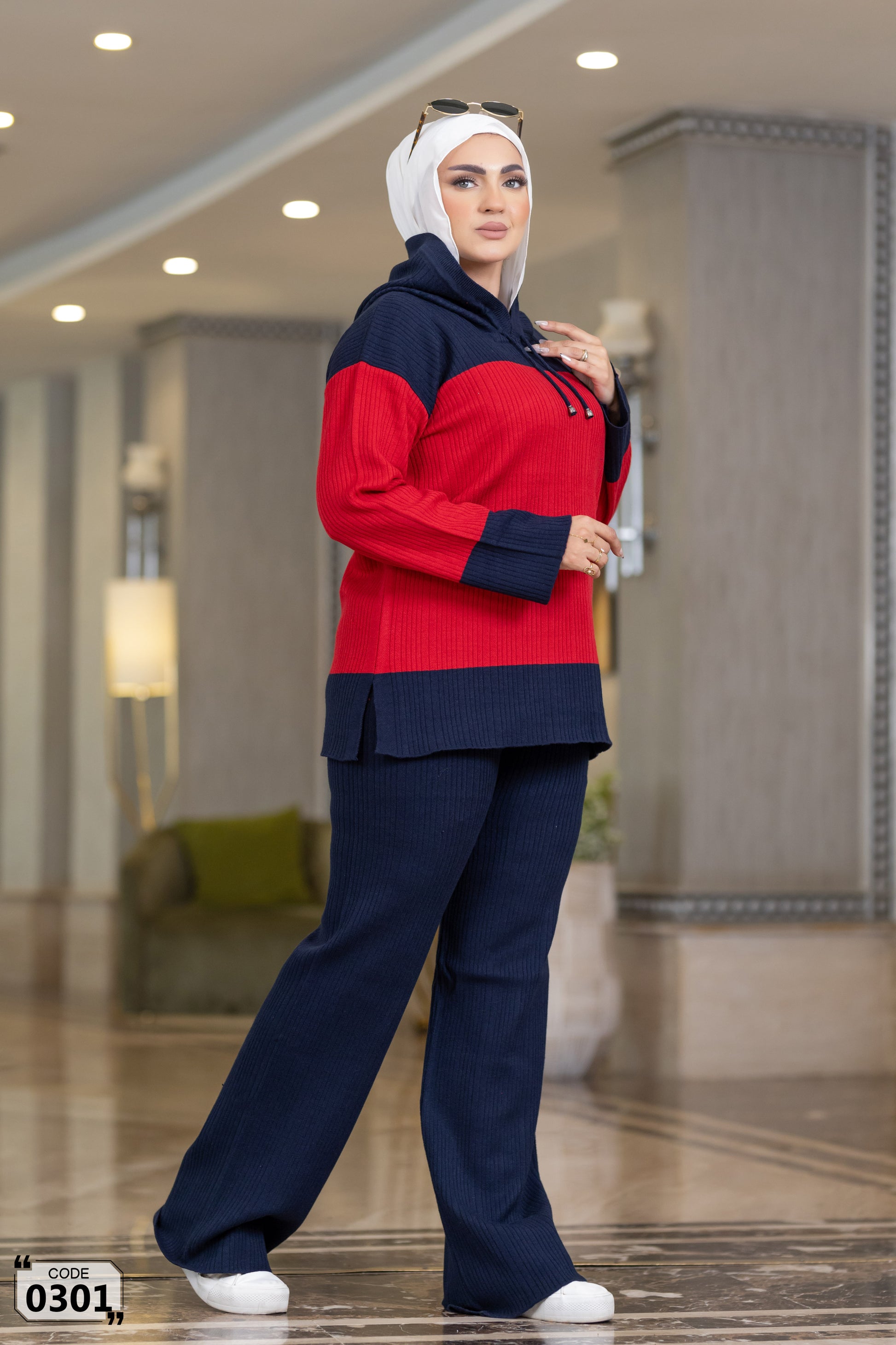 The long-sleeve top combines a clean white body with soothing blue accents on the hood, sleeves, and hem, creating a fresh, modern contrast. The coordinating blue ribbed pants complete the look, offering a relaxed yet streamlined fit. Perfect for casual outings, travel days, or chic at-home wear, this set blends style, softness, and versatility.