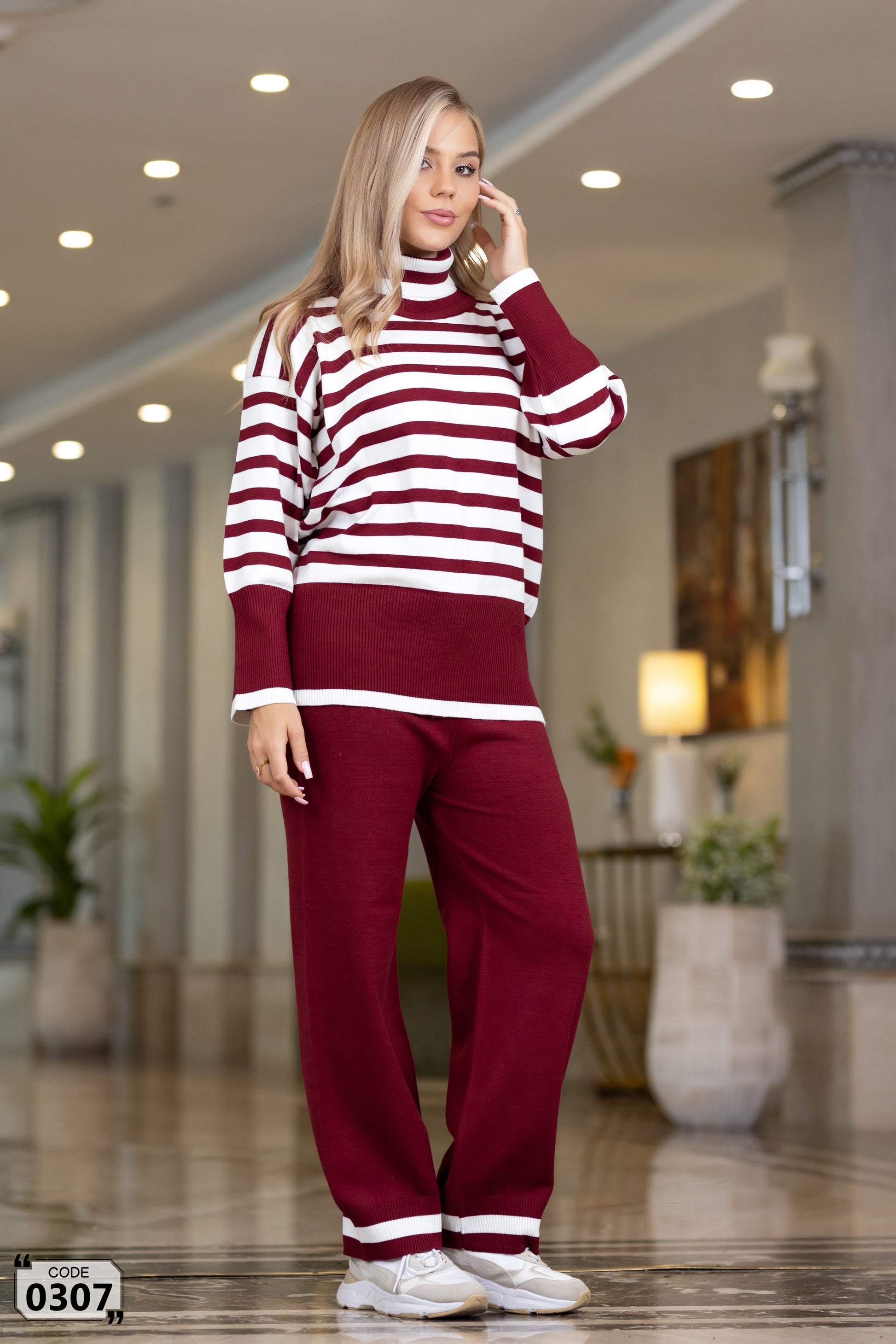 Bring effortless charm to your wardrobe with this cozy striped knit set designed for comfort and everyday style. The top features a classic white/black and colored stripe pattern with a soft turtleneck and ribbed hem, offering a relaxed yet polished look. Paired with matching olive knit pants, this coordinated set delivers warmth, stretch, and easy wearability. Perfect for casual outings, lounging, or travel days, it combines comfort with timeless style in one go-to outfit.