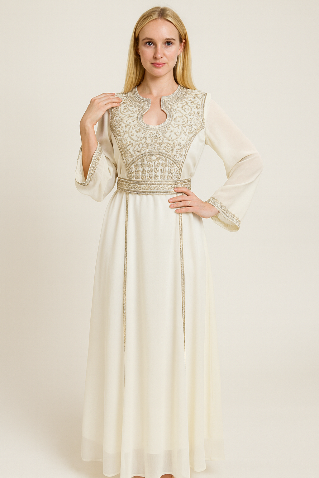 Intricate embroidery adorns the bodice, neckline, waist, and sleeves, creating a beautifully balanced and elegant look. The subtle keyhole neckline detail adds sophistication while maintaining modest coverage. Finished with gently flared sleeves and a full-length silhouette, this piece is perfect for special occasions, formal gatherings, or elegant evening wear.