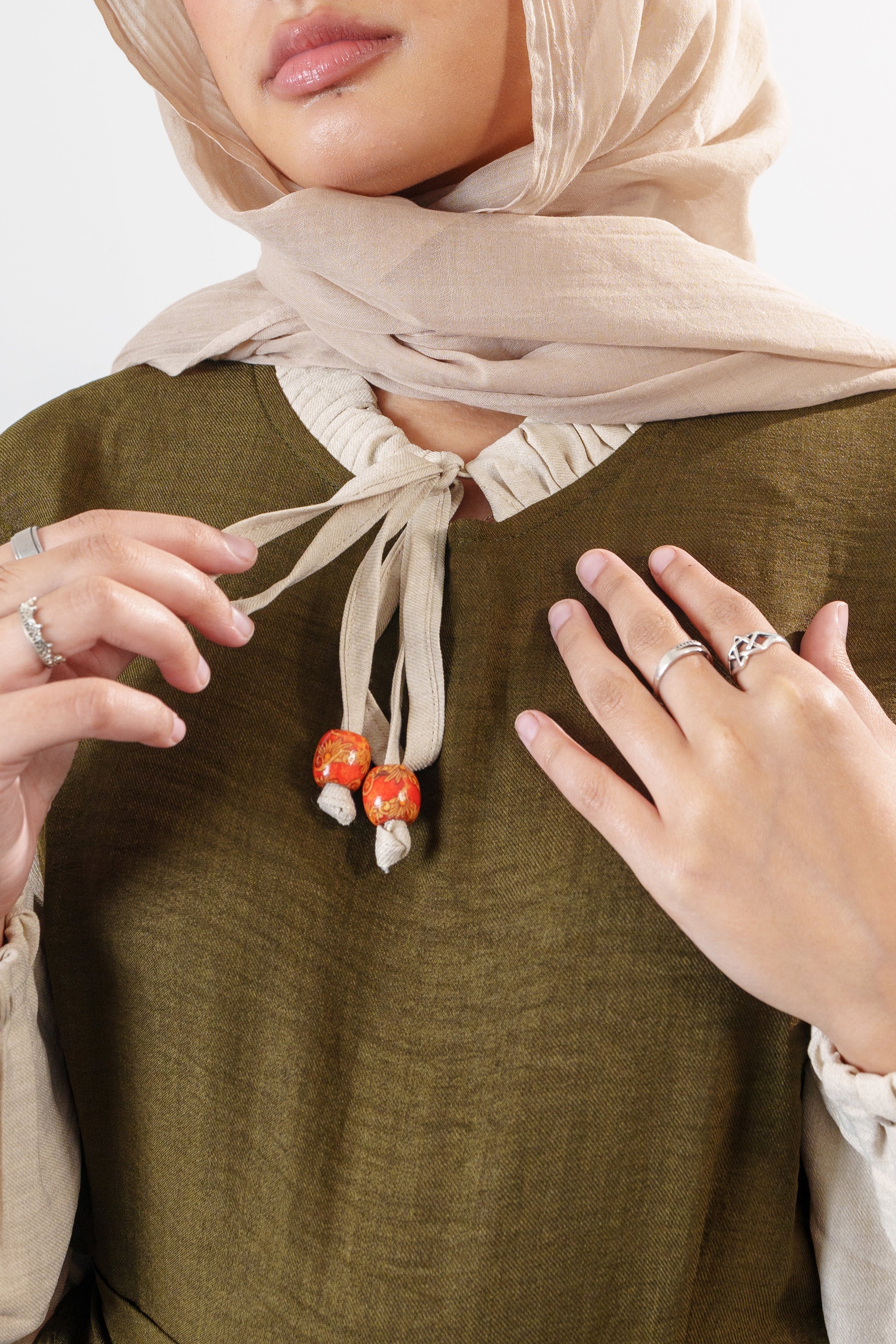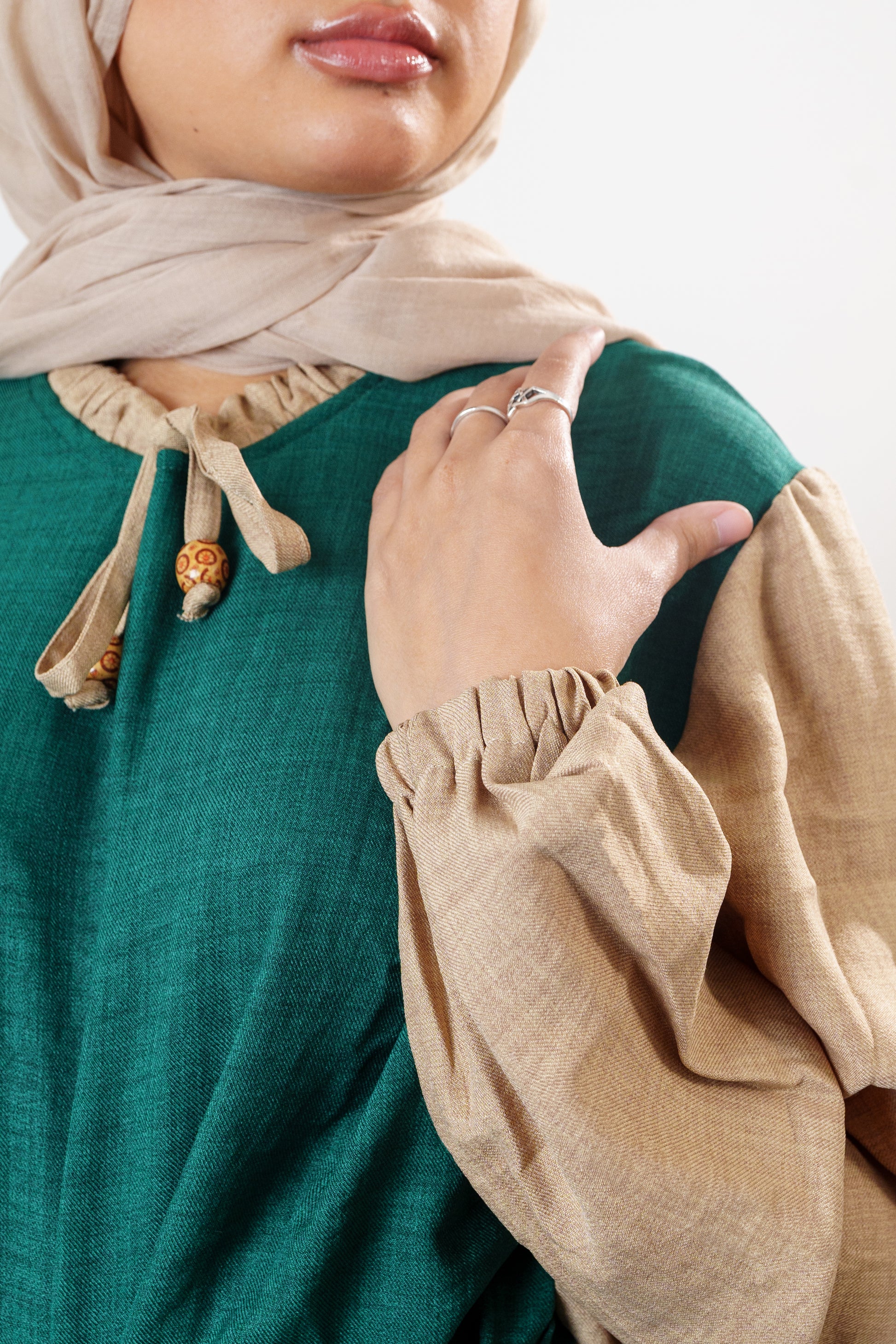 This is a modest long dress with beige sleeves and bow details