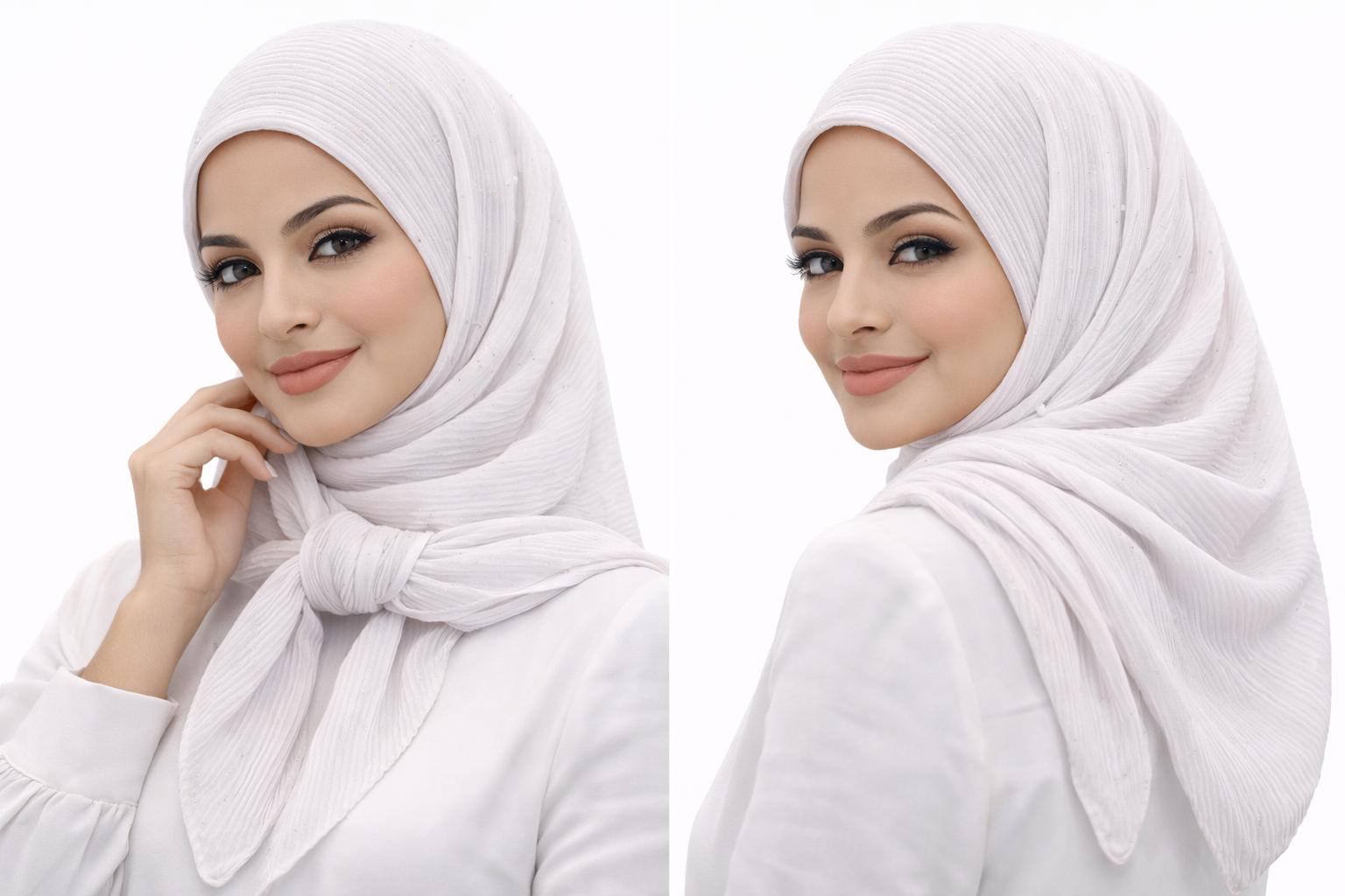Elevate your everyday and occasion looks with our Pleated Shimmer Hijab, designed for effortless elegance and graceful drape. Crafted from lightweight pleated fabric with subtle shimmer accents, this hijab catches the light beautifully without being overpowering. The soft texture allows for easy styling, making it perfect for both casual wear and formal events.
