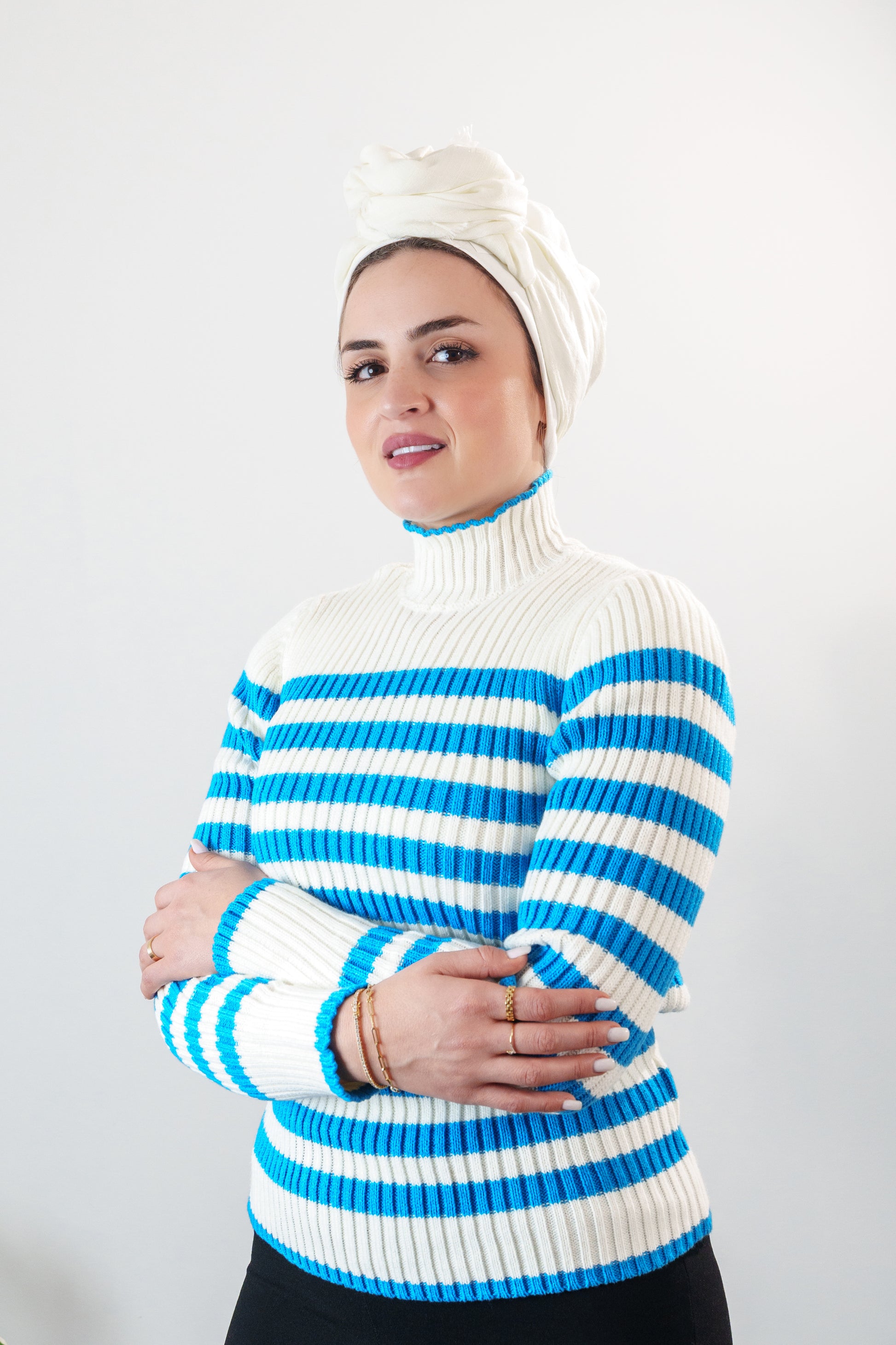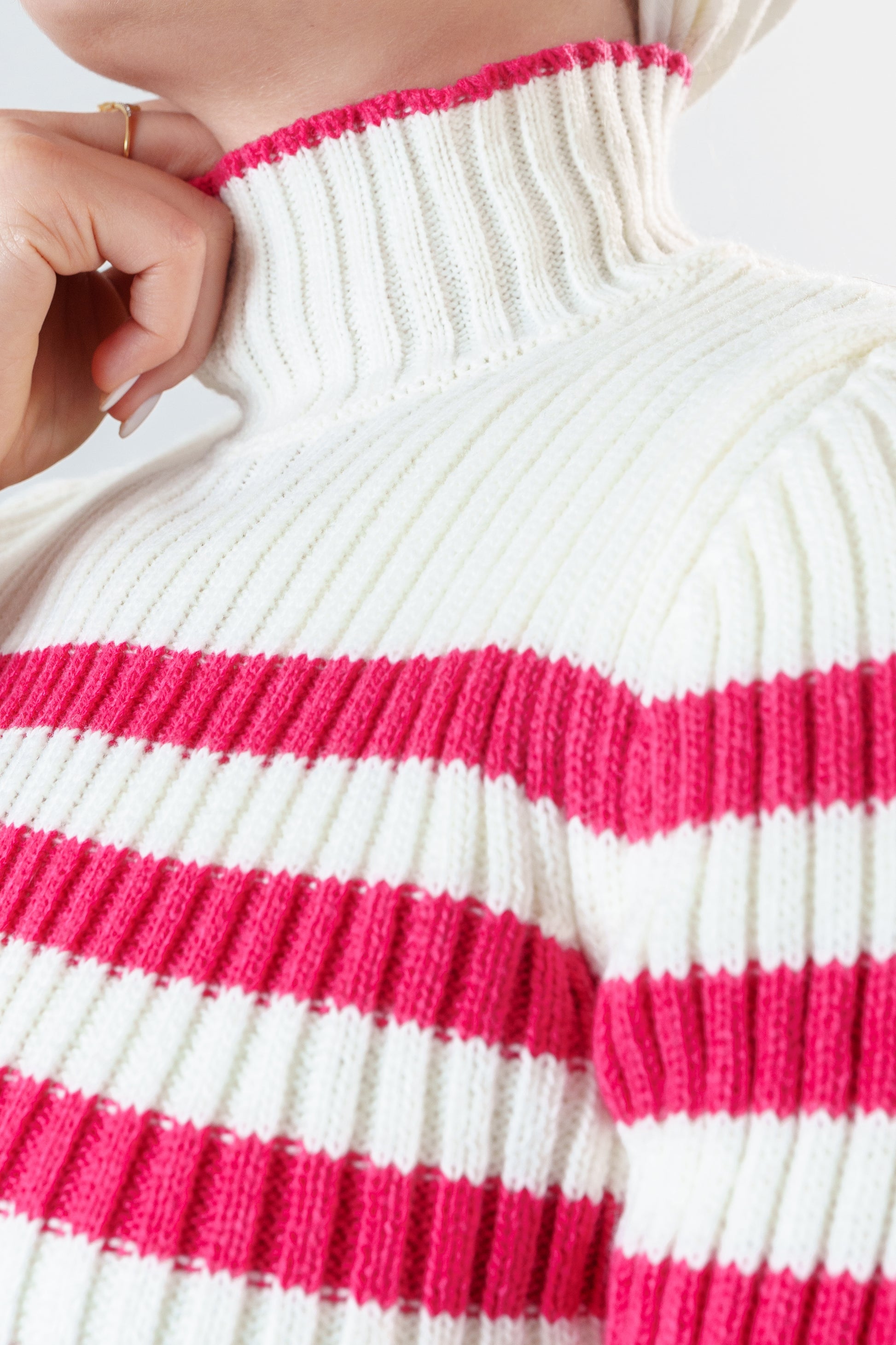this is featuring a turtle neck sweater with horizontal stripes, can be styled in various ways combines comfort and style, making it suitable for various occasions. If you have any questions or need further information, feel free to ask!